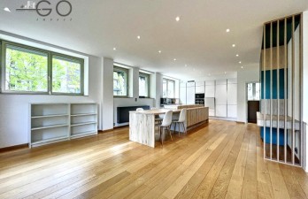 Luxueux appartement rénové en 2019 de +-140m² situé au 1er étage s/4 avec terrasse (+-15m²) + jardin (+-50m²) en cour intérieur. Ce logement se compose d’un hall d'entrée, dressings, 2 wc, spacieux living (+-65 m²), cuisine ouverte équipée avec îlot central et table de salle à manger incorporée, buanderie, 2 chambres (+-15m²) avec de nombreux placards, salle de douches, salle de bains avec baignoire, cave.
